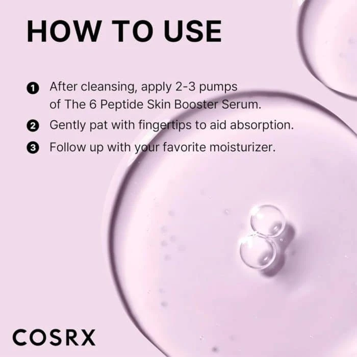 - پس از شستوی پوست با شوینده مناسب ،مقداری از سرم اسکین بوستر کوزارکس( 2 تا 3 پمپ از سرم) را روی پوست صورتتان پخش کنید وبا انگشتتان ضربه بزنید تا جذب شود و بعد از چند دقیقه از مرطوب کننده استفاده نمایید بهترین پیشنهاد استفاده با COSRX Snail 96 Essence مرطوب کننده و یا هر مرطوب کننده دیگر است.